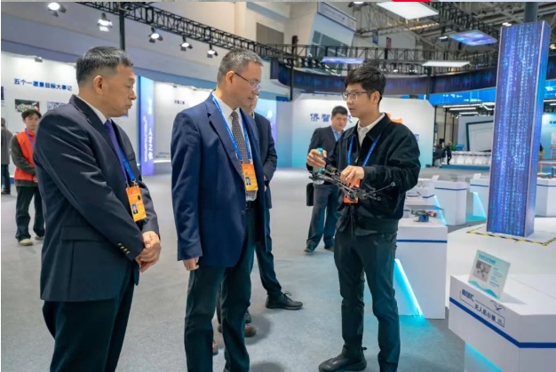 ▲“侨智汇”五个一成果展区,与会嘉宾正在参观无人机。