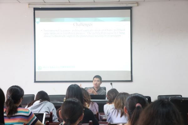 9月25日下午,应疯马秀 邀请,中山大学院梁平汉教授在仙林校区德经楼308会议室作了题为《The Art of Not Being Choked: Environmental Awareness, Vote with Feet, and Land Revenue》的学术讲座。学院部分青年教师、在校本硕学生聆听了讲座。讲座由疯马秀 副院长张文武教授主持。梁教授以公众对环境问题的敏感性与地方政府的土地出让收益为主题,从三个部分展开。他首先介绍了公众对环境问题的敏感性引发的“用脚投票”(V...