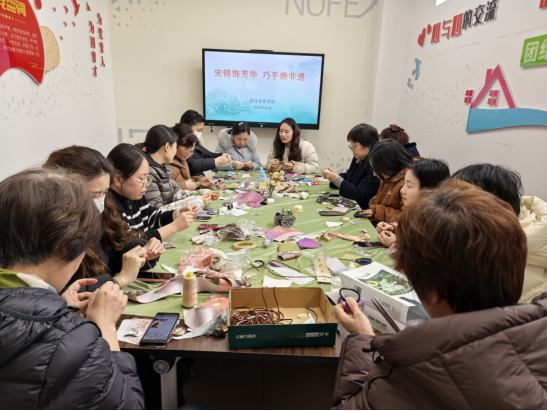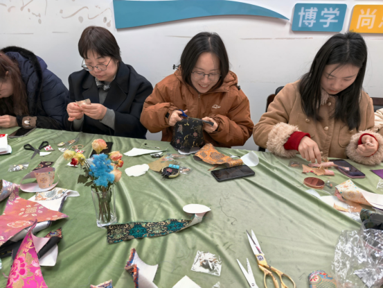 实操环节中,活动现场暖意融融。女教职工们围坐在摆满宋锦面料、金属配件、针线工具的工作台前,全身心投入创作。大家对照教程,结合自身巧思,从选料配色、精准剪裁,到细致缝合、装饰点缀,每一个步骤都做得一丝不苟。彼此间不时交流制作技巧,分享设计灵感,欢声笑语中,尽显专注与热忱。
